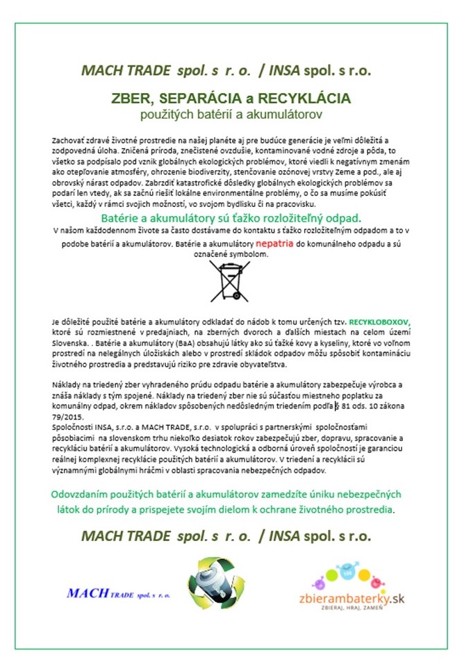 Odovzdaním použitých batérií a akumulátorov zamedzíte úniku nebezpečných látok do prírody a prispejete svojím dielom k ochrane životného prostredia.