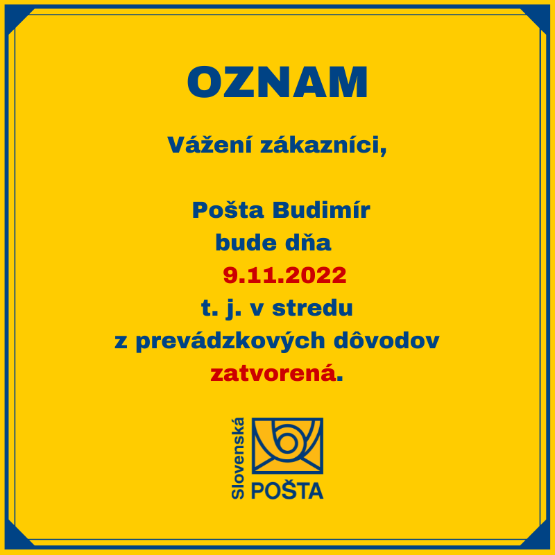 Pošta Budimír bude v stredu 9.11.2022 ZATVORENÁ!
