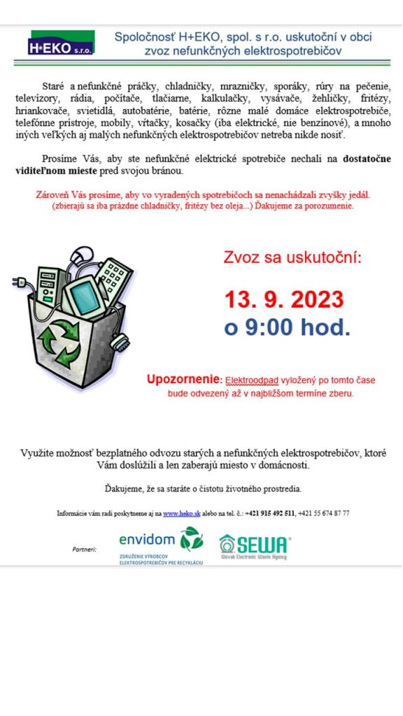 Zber elektroodpadu 13.9. 2023 (streda) v čase o 9:00 hod. - 37. týždeň